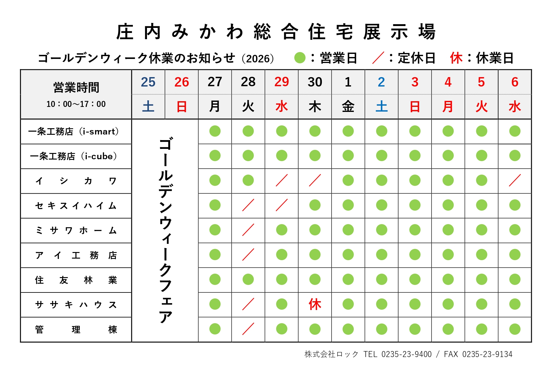 誠に勝手ながら、庄内みかわ総合住宅展示場では下記日程をゴールデンウィーク休業とさせていただきます。